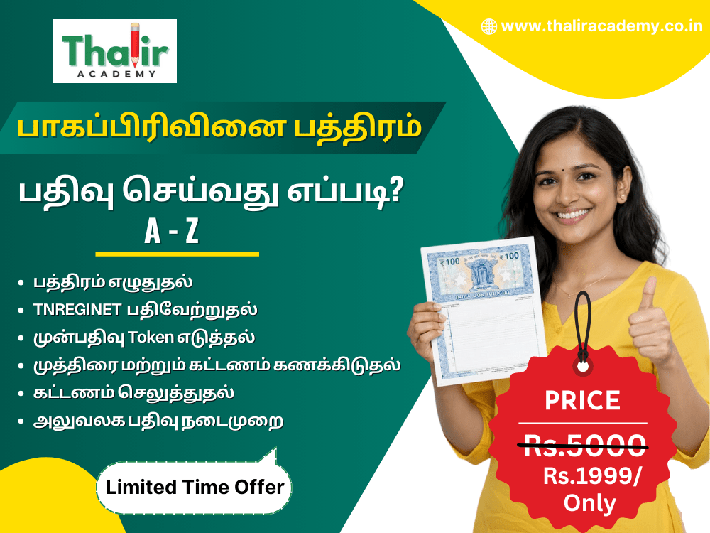 - Partition Deed registration-க்கு தேவையான procedure, documents, fee calculation, online process அனைத்தையும் step-by-step-ஆக கற்பிக்கும் course